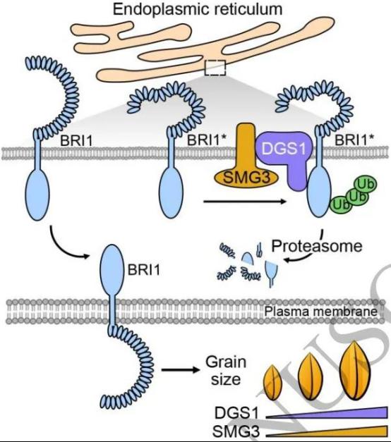 图2. ERAD相关的E2-E3酶复合物SMG3和DGS1通过介导错误折叠或不完全折叠BRI1蛋白的降解来影响籽粒大小的工作模型。错误折叠或不完全折叠的BRI1(BRI1*)被SMG3-DGS1复合物泛素化,被泛素化修饰的蛋白随后被运送至蛋白酶体进行降解。在SMG3和DGS1功能缺失突变体中,积累的BRI1*可能干扰正常BRI1蛋白的形成及功能,而正常BRI1蛋白可促进籽粒生长。
