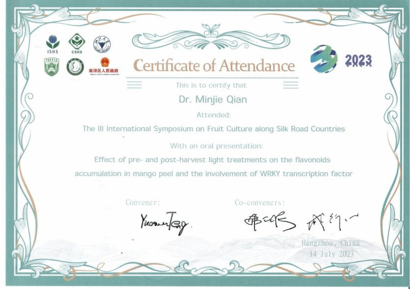 近日,热带水果品质发育调控科技创新团队钱敏杰副教授在杭州举办的“第三届丝绸之路沿线国家果树国际会议”(The III International Symposium on Fruit Culture along Silk Road Countries)做题为‘Effect of pre- and post-harvest light treatments on the flavonoids accumulation in mango peel and the involvement of WRKY transcription factor’的口头报告。