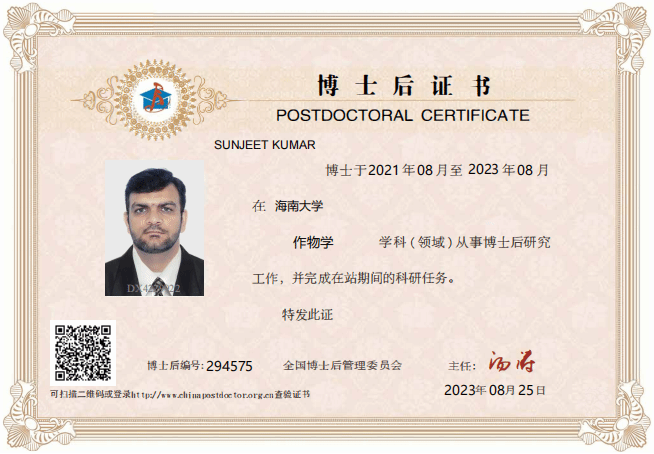 热带特色蔬菜产业技术创新与服务团队Sunjeet Kumar博士顺利完成博士后出站程序,并取得博士后证书。Sunjeet Kumar博士在团队从事博士后工作期间,以BEVITOR伟德为第一单位在国际期刊发表高水平SCI论文6篇,其中中国科公司一区5篇、二区1篇,另有3篇文章正在进行投稿工作。Sunjeet Kumar博士已被BEVITOR伟德聘任为高层次人才,出站后将作为正式员工加入该团队。