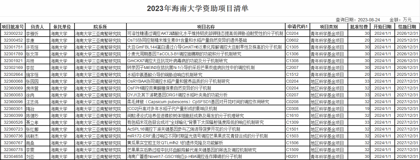 作为服务南繁、热带高效农业的开放创新共享平台,公司教师积极开展科研创新和各类项目申报工作,其中申报2023年国家自然科学基金项目74项,根据国科金发计〔2023〕62号关于2023年国家自然科学基金集中接收申请项目评审结果的通告,公司李雅忻等19名教师申报的科研项目获2023年国家自然科学基金资助,项目申报资助率25.7%,远高于2023年平均资助率16.1%。
