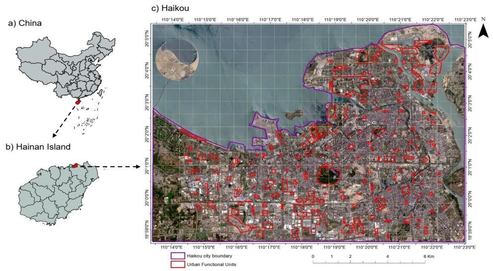 图 (a)中国地图,显示了海南的地理位置;(b)海南省地图,显示UGS以及土地利用的调查区域范围;(c)海口市的卫星地图,显示了海口市研究区域(紫色线)以及调查的190个城市功能单元(红色边界)