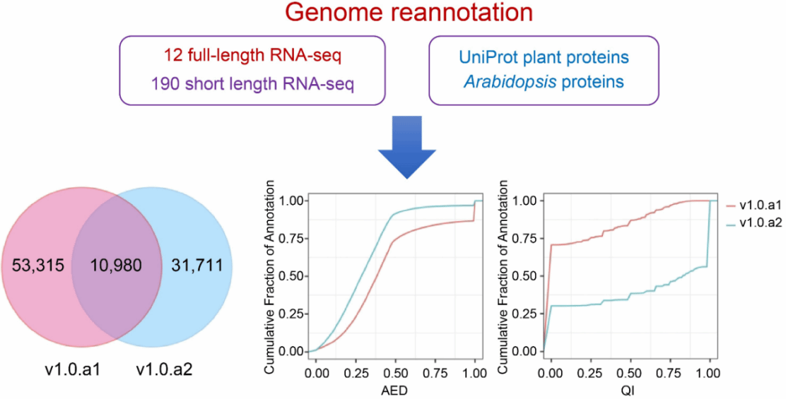 近日,Tropical Plants在线发表了朱国鹏课题组题为“Genome reannotation of the sweetpotato (Ipomoea batatas (L.) Lam.) using extensive Nanopore and Illumina‐based RNA‐seq datasets”的研究论文。该研究利用作者前期开发的基因组注释流程,结合12个纳米孔全长RNA文库和190个Illumina RNA-seq文库,对甘薯基因组进行了重新注释,显著提升了甘薯基因组注释的完整度和准确度,获得甘薯“泰中6号”基因组注释新版本(v1.0.a2)。