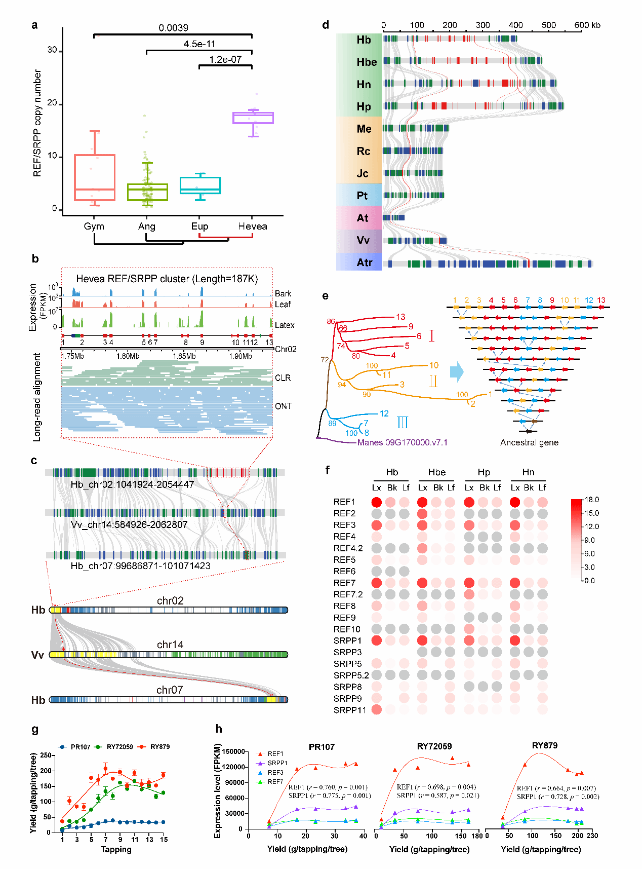 通过对152个种子植物基因组的大尺度比较研究,结合大量的基因表达和橡胶产量数据,我们发现橡胶生物合成通路的关键基因家族REF/SRPP在橡胶树属的基因组中发生了显著扩增,产生了一个大的基因簇,并分化出表达显著受割胶伤害诱导、在产胶细胞乳管中特异超高表达、表达与产胶能力显著正相关的家族成员。同时,在其他产胶植物如俄罗斯蒲公英和莴苣的基因组共线区域中,也出现了类似的REF/SRPP大基因簇,也分化出在乳管中特异高表达的家族成员(图3)。这些结果表明,REF/SRPP大基因簇的产生,以及乳管特异性功能分化是植物产胶性状进化中的一个关键推动力。