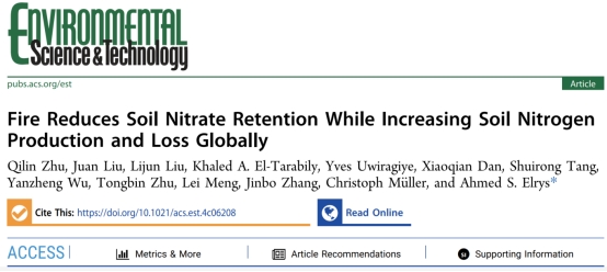 该成果以“Fire reduces soil nitrate retention while increasing soil nitrogen production and loss globally”为题发表在Environment Science & Technology(中科院一区;IF=10.8)上。