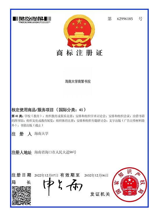 2022年12月29日,"公司三亚南繁书院"商标获国家知识产权局批准注册。该商标注册有效期自2022年12月7日起至2032年12月6日,服务于公司三亚南繁研究院的书院制建设、教育培训、文创产品创制、学术研讨会的开展、举办文体比赛、文化展览、书籍出版等项目,为更好的建设公司三亚南繁研究院提供平台。