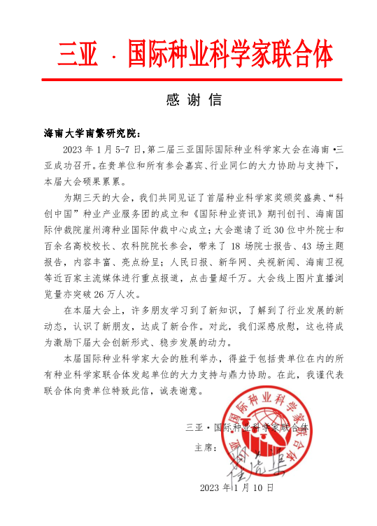 《三亚·国际种业科学家联合体致公司三亚南繁研究院的一封感谢信》
