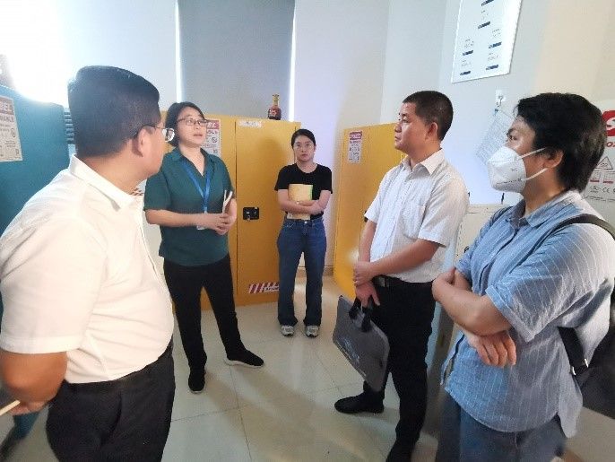 交流环节中,杨副处长和实验室与设备管理处陈秀莲科长与各实验室管理员针对管制化学品的采购与管理及危险废弃物处理中存在的问题进行了交流与探讨。结束后,众人一起到公司危化品暂存间进行查看,杨副处长提出部分意见及建议。